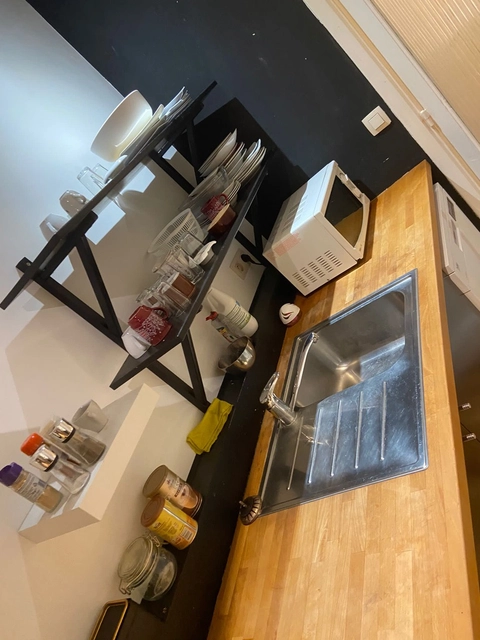 La cuisine est entièrement équipée incluant un four, un réfrigérateur, un lave-vaisselle, une machine à café, ainsi qu’un ensemble d’ustensiles et de vaisselle. Elle est idéale pour ceux qui aiment cuisiner ou simplement prendre un repas rapide avant de sortir. La salle de bain est moderne et fonctionnelle, avec une baignoire.